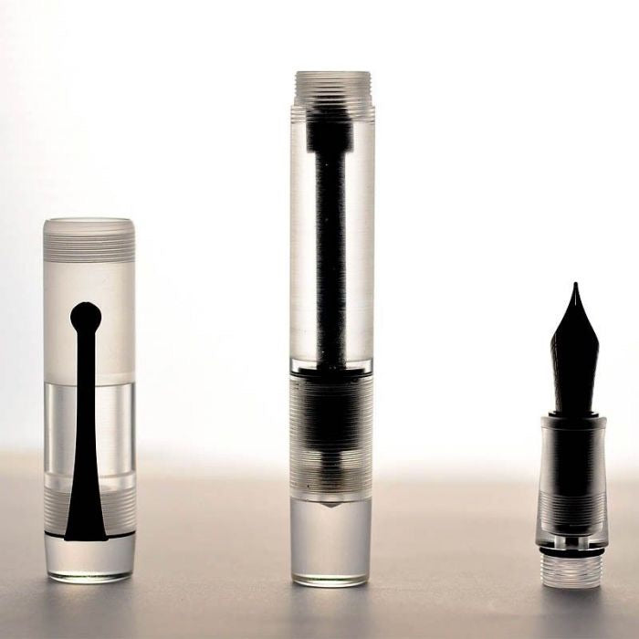 The box contains a simple rubber and glass pipette, which you use to drip ink directly into the pen barrel, from the section end.