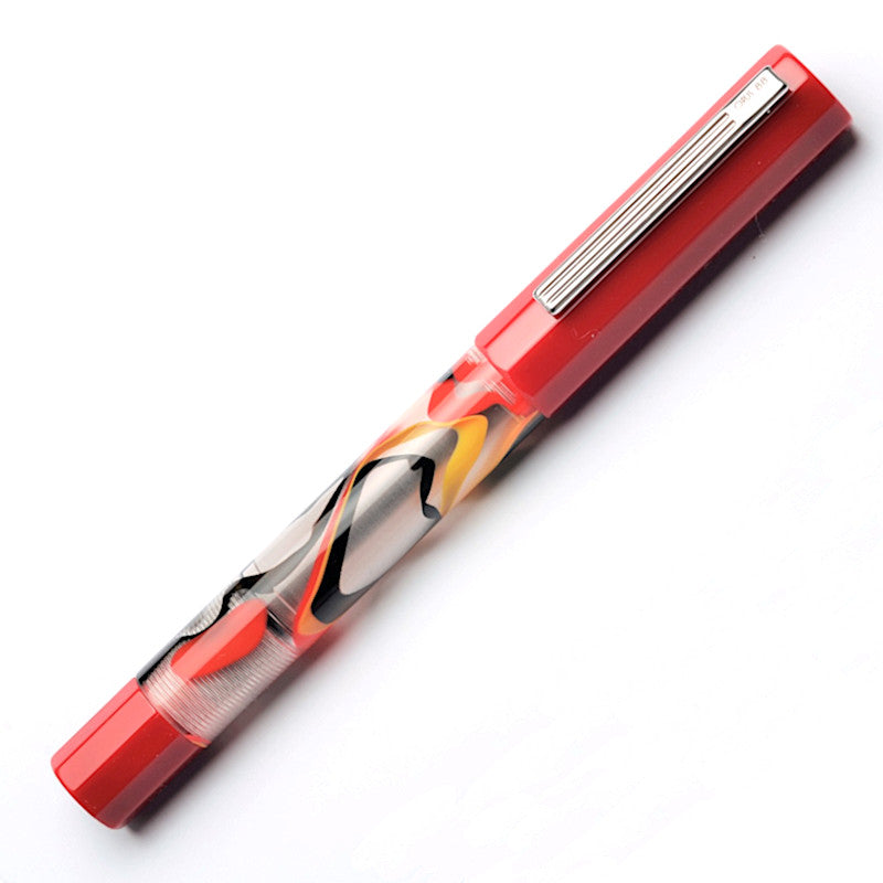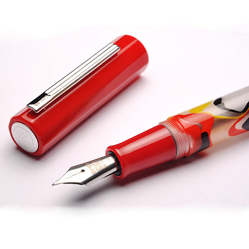 The new Opus 88 Flow fountain pen features solid resin colored cap and a translucent, acrylic body with playful colored swirls.